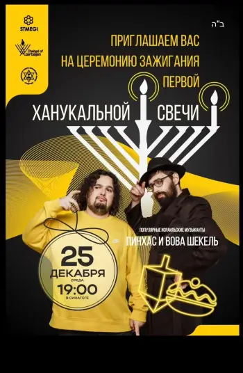 Приглашаем Вас 25 декабря в 19.00 на зажигание первой ханукальной свечи 5784 г. в синагоге ашкеназских евреев. А также праздничный концерт с участием известного дуэта - ПИНХАС И ВОВА ШЕКЕЛЬ.