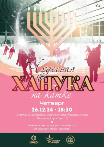 Приглашаем всех на незабываемое празднование Хануки на катке! Мероприятие состоится в четверг, 26 декабря 2024 года, в 18:30, в Спортивно-концертном комплексе имени Гейдара Алиева (Тбилисский проспект, 12). В программе — праздничная атмосфера, весёлое катание на коньках и зажжение ханукии.