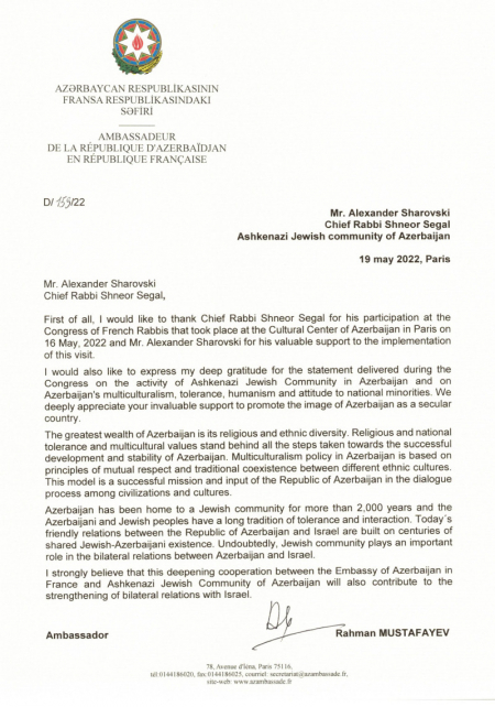 16 мая 2022г в столице Франции Париже прошел Конгресс Раввинов Франции. Заседание Конгресса проходили в Помещении Культурного центра Азербайджана в Париже.