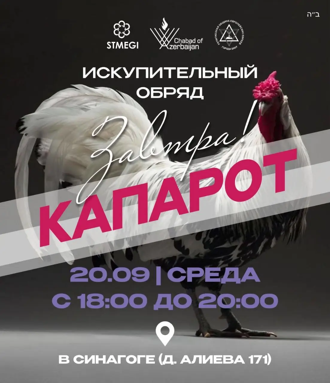 Капарот – древний обычай, согласно которому перед Йом Кипуром берут петуха или курицу и вращают над головой, говоря при этом, что этот петух или курица являются заменой этого человека. Петуха относят к шохету (резнику) для шхиты. Зарезанного петуха (либо деньги, вырученные с его продажи) отдают бедным людям в качестве пожертвования.