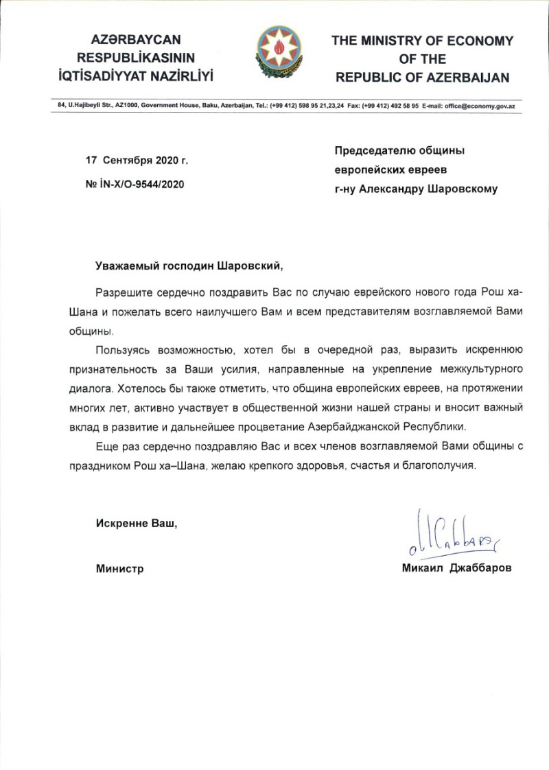 Пользуясь возможностью, хотел бы в очередной раз, выразить искреннюю признательность за Ваши усилия, направленные на укрепление межкультурного диалога. Хотелось бы также отметить, что община европейских евреев, на протяжении многих лет, активно участвует в общественной жизни нашей страны и вносит важный вклад в развитие и дальнейшее процветание Азербайджанской Республики.
