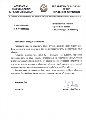 Поздравление от Министра Экономики господина Микаила Джаббарова