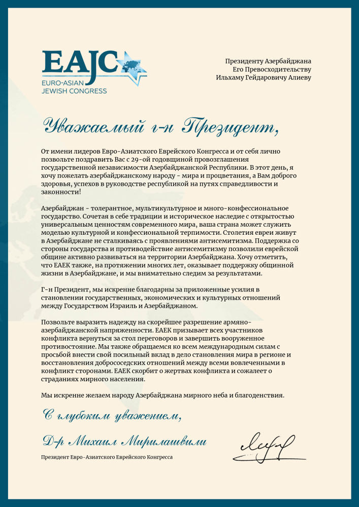 От имени лидеров Евро-Азиатского Еврейского Конгресса и от себя лично позвольте поздравить Вас с 29-ой годовщиной провозглашения государственной независимости Азербайджанской Республики. В этот день, я хочу пожелать азербайджанскому народу - мира и процветания, а Вам доброго здоровья, успехов в руководстве республикой на путях справедливости и законности!